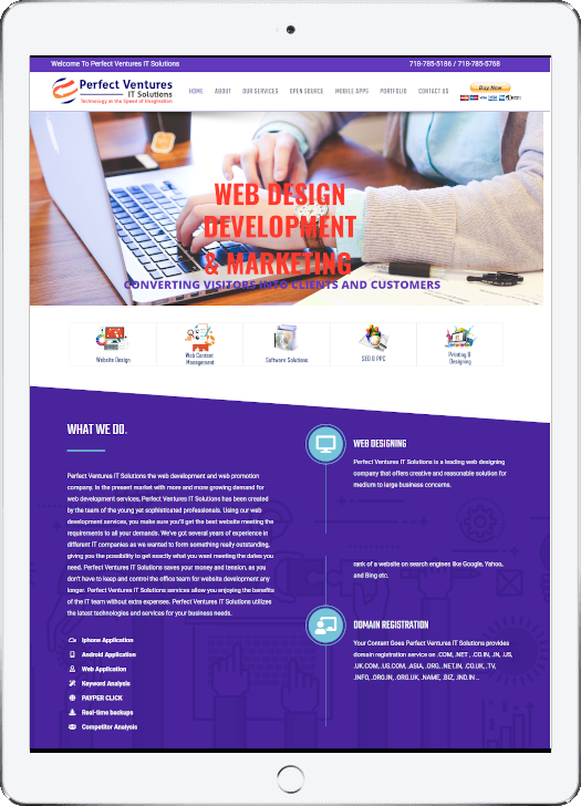 Perfect Ventures IT Solutions the web development and web promotion company. In the present market with more and more growing demand for web development services, Perfect Ventures IT Solutions has been created by the team of the young yet sophisticated professionals. Using our web development services, you make sure you’ll get the best website meeting the requirements to all your demands. We’ve got several years of experience in different IT companies as we wanted to form something really outstanding, giving you the possibility to get exactly what you want meeting the dates you need. Perfect Ventures IT Solutions saves your money and tension, as you don’t have to keep and control the office team for website development any longer. Perfect Ventures IT Solutions services allow you enjoying the benefits of the IT team without extra expenses. Perfect Ventures IT Solutions utilizes the latest technologies and services for your business needs.